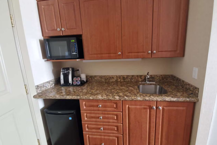 King bed in a separate room, sitting area with pullp=pout sofa, kitchenette (mini fridge, microwave, cupboards and kitchen sink), roll-in shower with grab bars & shower chair (available upon request), larger door ways and accessible door bell
